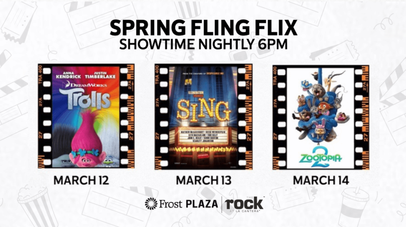 Get ready for Spring Break fun with free outdoor movie nights at Spring Fling Flix, one of San Antonio’s best family-friendly events! Join us at Frost Plaza for three nights of classic, family-favorite films on our giant 40-ft LED screen — perfect for a Spring Break staycation with food, friends, and community vibes.