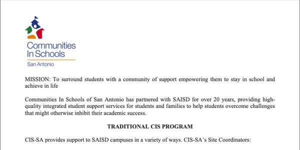 Communities In Schools of San Antonio has partnered with SAISD for over 20 years, providing high-quality integrated student support services for students and families to help students overcome challenges that might otherwise inhibit their academic success.