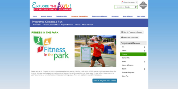The San Antonio Parks and Recreation Department offers a variety of fitness opportunities at various facilities. Registration for programs and classes must be completed at the specific facility.