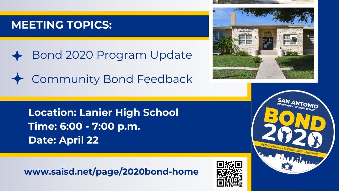 San Antonio ISD In-Person Bond Community Meeting April 22, 2025 @ 6:00 pm - 7:00 pm Lanier High School 1514 W Cesar E. Chavez Blvd, San Antonio, TX, United States San Antonio ISD invites the community to come to an [...]